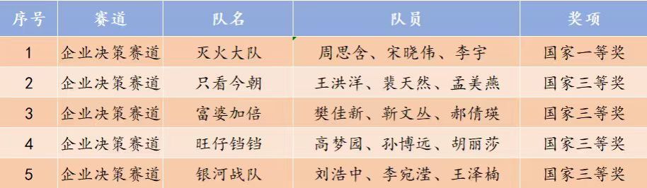 决赛期间, 面对复杂的企业决策场景,队员们围绕核心问题展开头脑风暴,在观点碰撞中凝聚共识 。 由队长周思含,队员宋晓伟、李宇组成的“灭火大队”在企业决策赛道(MBA组)以D赛区第一的成绩荣获一等奖,这是我校首次获得该项赛事的国家一等奖。此外,“只看今朝”“富婆加倍”“旺仔铛铛”“银河战队”四支队伍表现优异,均斩获国家三等奖。