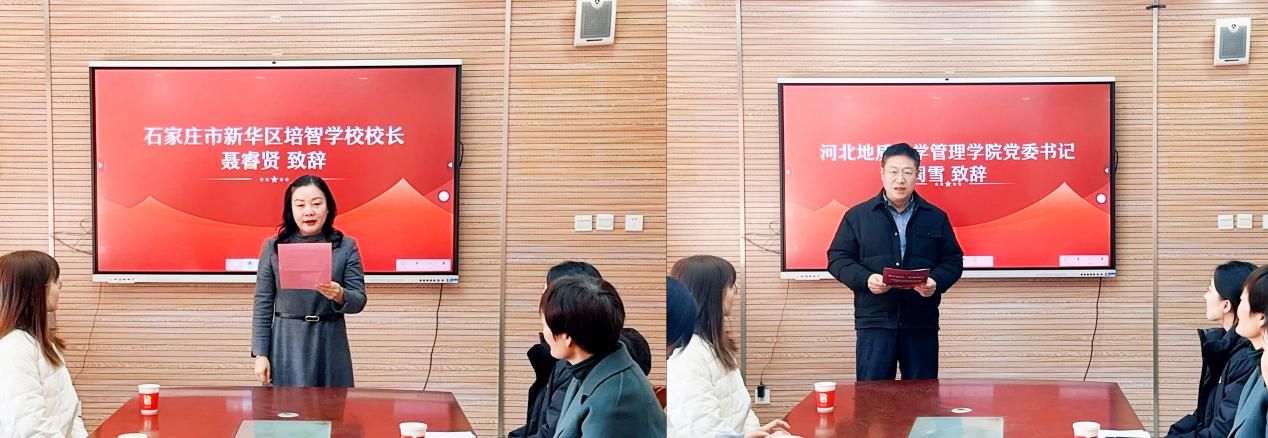 河北地质大学管理学院党委书记周雪致辞,他表示河北地质大学始终牢记高校社会责任,一直将“责任担当、爱心奉献”融入党员培养,希望通过本次活动为特殊儿童送去物资、传递温暖,也为双方搭建长期交流的桥梁。